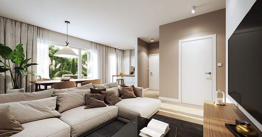 Dom typu S+ na parterze to 52,54 m2 starannie przemyślanej powierzchni wewnętrznej, która łączy nowoczesną funkcjonalność z przytulnym charakterem idealnym do codziennego wypoczynku. Wejście prowadzi przez wiatrołap oraz korytarz, do serca domu, słonecznego salonu z aneksem kuchennym. Dzięki zastosowaniu ogrzewania podłogowego strefa dzienna jest niesamowicie ustawna i oferuje pełną swobodę aranżacji. Bezpośrednim przedłużeniem salonu jest ogród, który stanowi idealne miejsce na odpoczynek. Obok strefy dziennej znajdują się dwa ustawne pokoje, a także funkcjonalna łazienka. Wybierając dom typu S+, zyskujesz własny ogród, który będzie idealnym miejscem na poranną kawę, relaks po pracy oraz rodzinne spotkania na świeżym powietrzu.