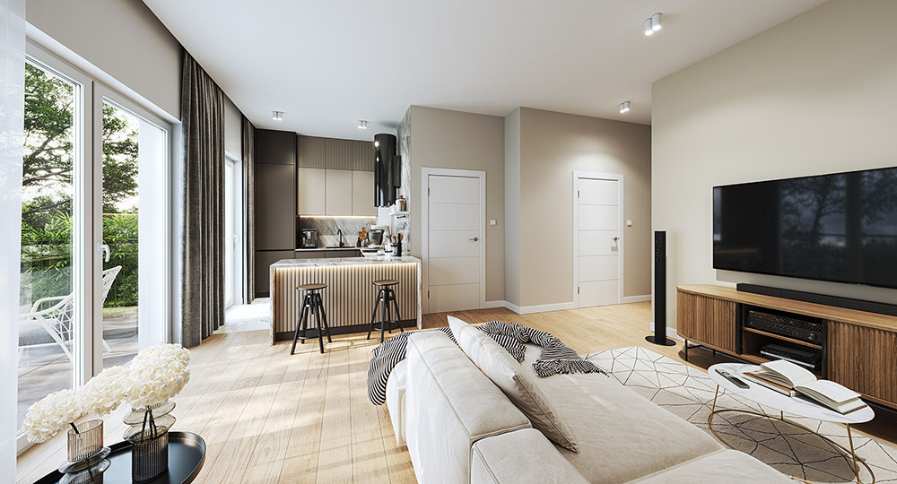 Dom typu M+ na parterze oferuje 69,55 m² powierzchni wewnętrznej, która wyróżnia się niezwykle praktycznym układem. Wejście prowadzi przez wygodny wiatrołap do serca domu, słonecznego salonu z aneksem kuchennym. Dzięki zastosowaniu ogrzewania podłogowego wnętrze jest niesamowicie ustawne, co pozwala na dowolną aranżację mebli i pełne wykorzystanie przestrzeni strefy dziennej. Obok salonu znajdują się dwa pokoje, oraz funkcjonalna łazienka. Wybierając dom typu M+, możesz cieszyć się własnym ogrodem, do którego prowadzi bezpośrednie wyjście z salonu. Ta dodatkowa zielona przestrzeń zapewnia miejsce do odpoczynku na świeżym powietrzu.