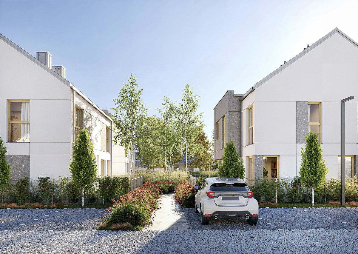 Na parterze znajduje się przestronny salon z aneksem kuchennym, tworzący serce domu, gabinet idealny do pracy oraz praktyczna toaleta. Duże przeszklenia zapewniają jasne wnętrza i wygodną przestrzeń do życia. Piętro tworzy komfortowa strefa prywatna z trzema pokojami, przestronną łazienką i schowkiem, który ułatwia przechowywanie.